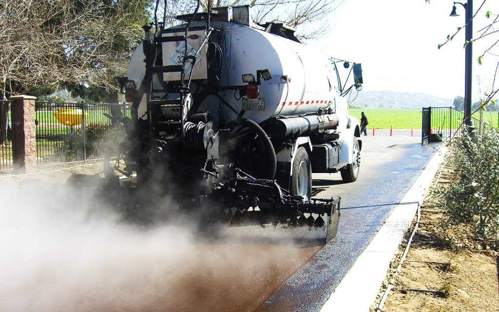 Fog seals are a method of adding asphalt to an existing pavement surface to improve sealing or waterproofing, prevent further stone loss by holding aggregate in place, or simply improve the surface appearance. (See above before (L) and after (R). To achieve this, the fog seal material (emulsion) must fill the voids in the surface of the pavement. This is accomplished in two steps. First, prior to application the surface must be thoroughly cleaned, using any combination of a blower, sweeper truck, and/or water truck. Second, during its application it must have sufficiently low viscosity so as to not break before it penetrates the surface voids of the pavement. This is accomplished by using a slow setting emulsion that is diluted with water.